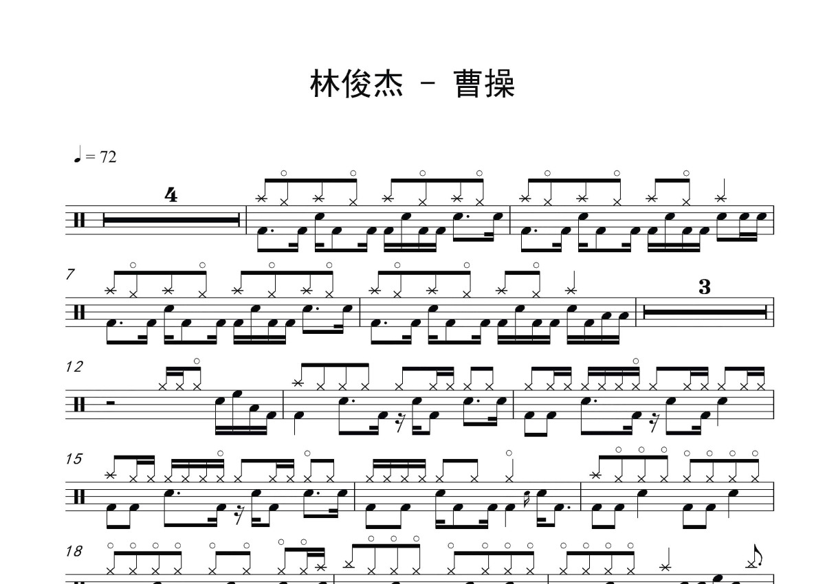 《曹操》是林俊杰演唱的一首歌曲,这份鼓谱共有两张高清图谱,图谱由 @打鼓谱 编配上传,图谱使用五线谱编配,使用这份曹操架子鼓谱,你将能够轻松地敲打出这首林俊杰的曹操,快来尝试吧。《曹操》是林俊杰2006年发行的专辑。作词者包括林秋离、林俊杰等人,作曲由林俊杰一人完成,全专辑共11首歌曲(内地版为10首歌曲,马来西亚版为12首歌曲)。2006年凭借该专辑林俊杰在中国原创音乐流行榜上获得港台金曲奖,并在第6届全球华语歌曲排行榜上获得二十大最受欢迎金曲、最受欢迎创作歌手两个奖项。林俊杰(JJ Lin),1981年3月27日出生于新加坡,祖籍中国福建省厦门市同安区 [1] ,华语流行乐男歌手、音乐人、潮牌主理人。