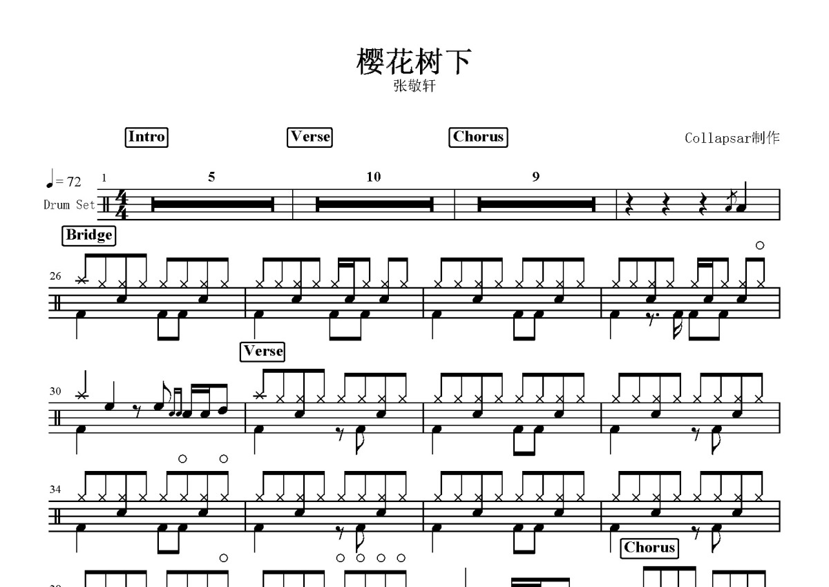 张敬轩《樱花树下》鼓谱 - 架子鼓谱