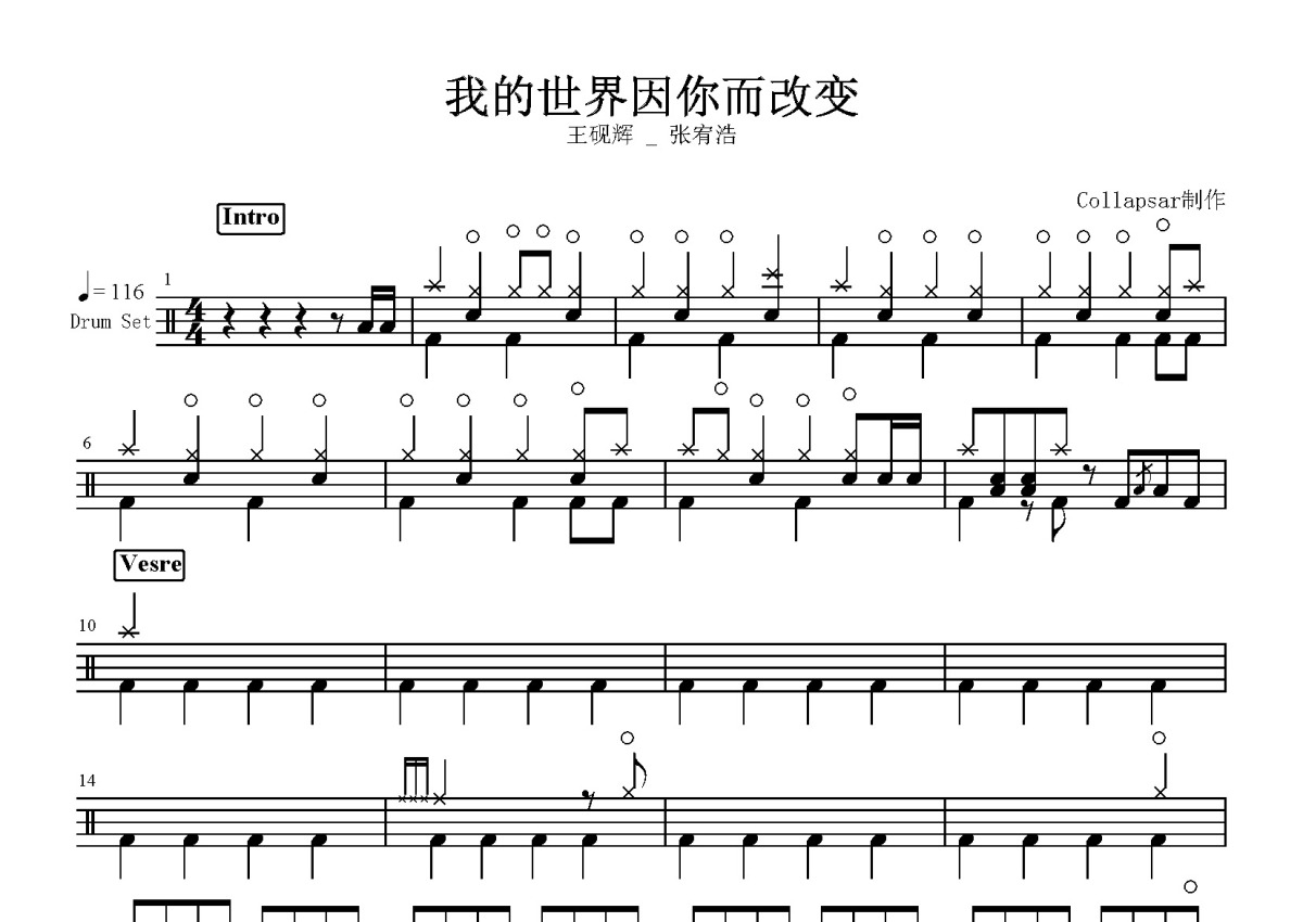 王砚辉/张宥浩《我的世界因你而改变》鼓谱 - 架子鼓谱