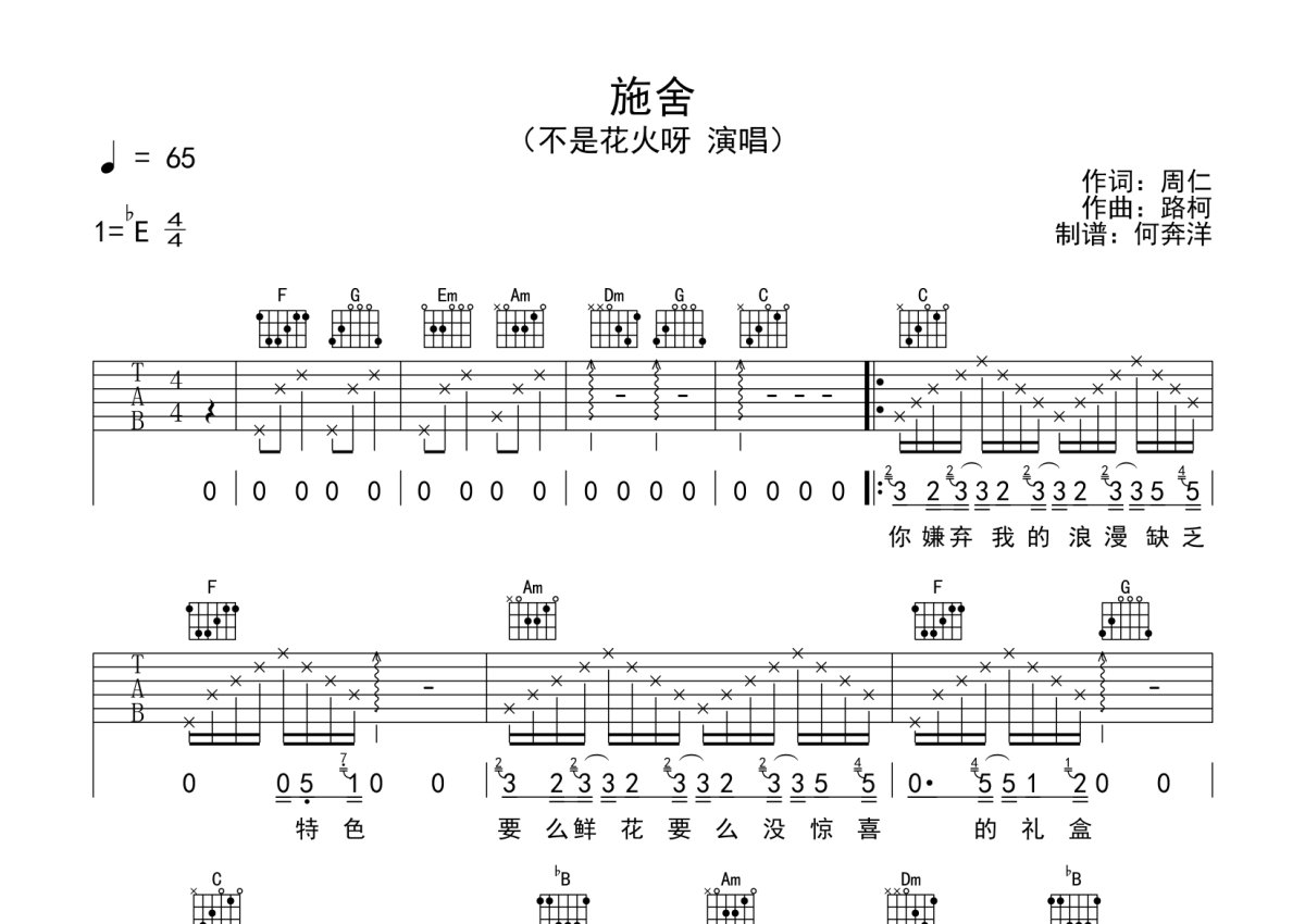 不是花火呀《施舍》吉他谱 - C调弹唱六线谱