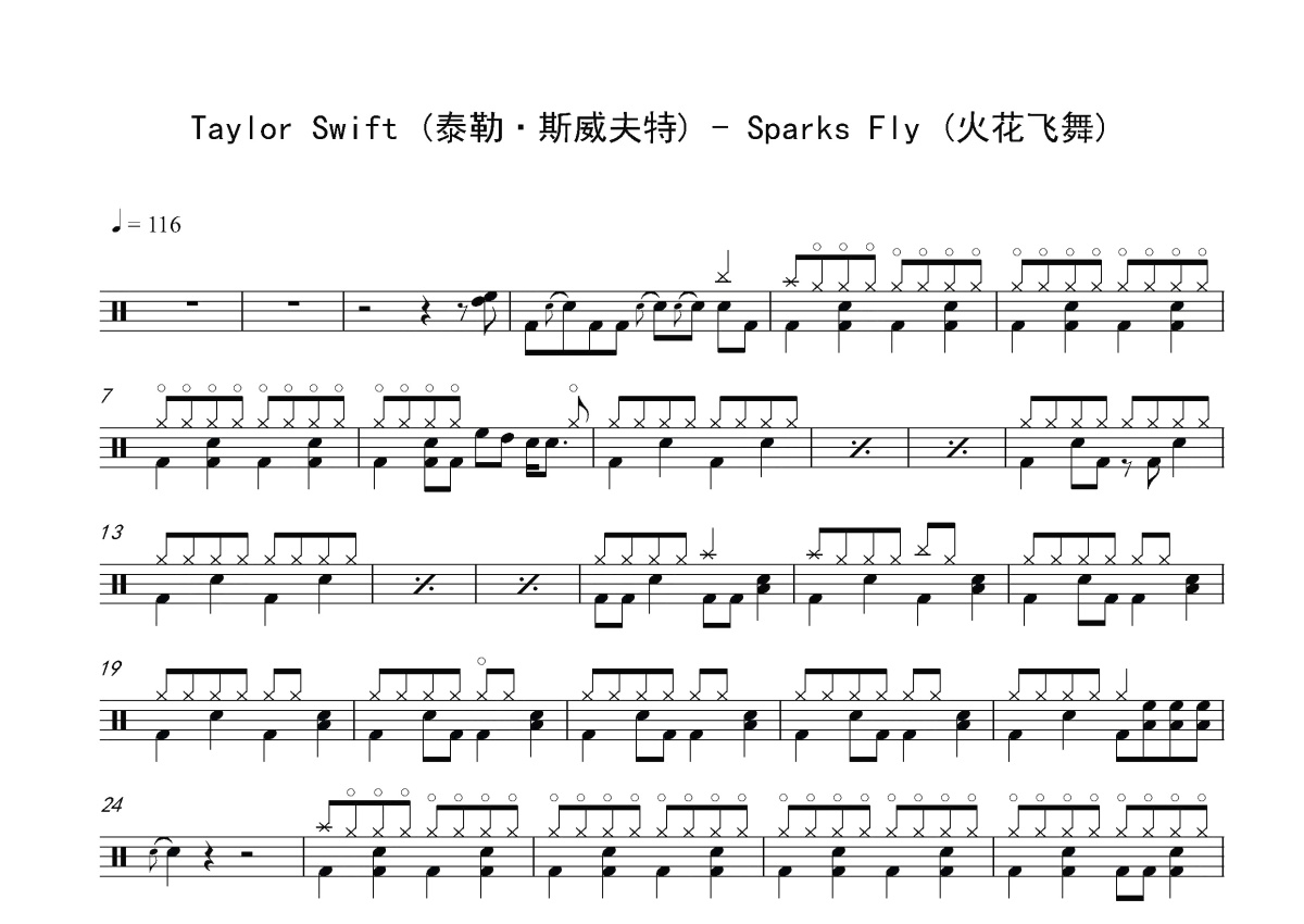 《Sparks Fly》是Taylor Swift (泰勒·斯威夫特)演唱的一首歌曲,这份鼓谱共有两张高清图谱,图谱由 @打鼓谱 编配上传,图谱使用五线谱编配,使用这份Sparks Fly架子鼓谱,你将能够轻松地敲打出这首Taylor Swift (泰勒·斯威夫特)的Sparks Fly,快来尝试吧。《Sparks Fly》是泰勒·斯威夫特演唱的一首歌曲,词曲由泰勒·斯威夫特编写,由内森·查尔曼制作,收录于泰勒·斯威夫特第三张录音室专辑《Speak Now》中,并作为推广专辑的第五支单曲于2011年8月10日通过大机器唱片公司发行。