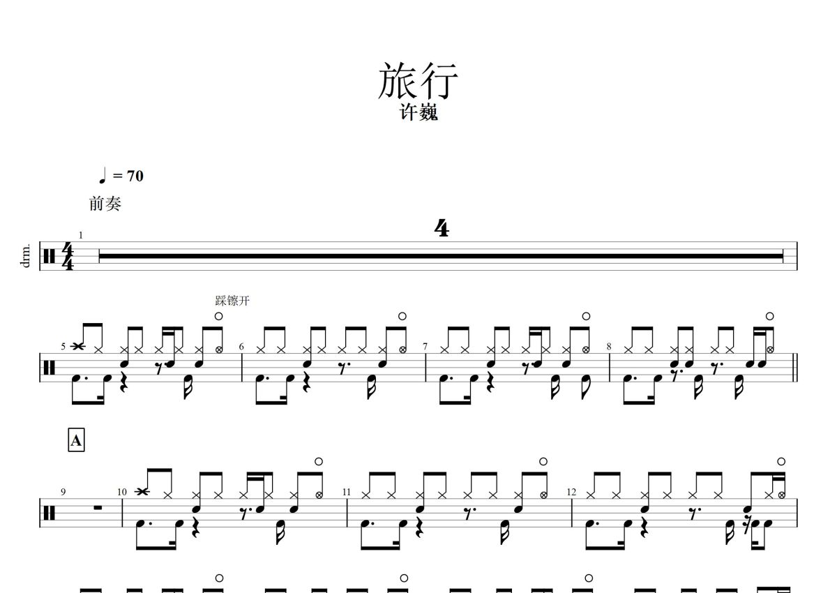 《旅行》是许巍演唱的一首歌曲,这份鼓谱共有三张高清图谱,图谱由 @打鼓谱 编配上传,图谱使用五线谱编配,使用这份旅行架子鼓谱,你将能够轻松地敲打出这首许巍的旅行,快来尝试吧。《旅行》是许巍演唱的一首歌曲,由许巍作词、作曲。收录在其2004年发行的专辑《每一刻都是崭新的》中。2014年该曲成为电影《后会无期》的插曲之一 。 2005年该曲获得第十二届中国歌曲排行榜年度金曲奖 ,2006年获得雪碧中国原创音乐流行榜内地金曲奖 及东方风云榜颁奖盛典十大金曲奖。
