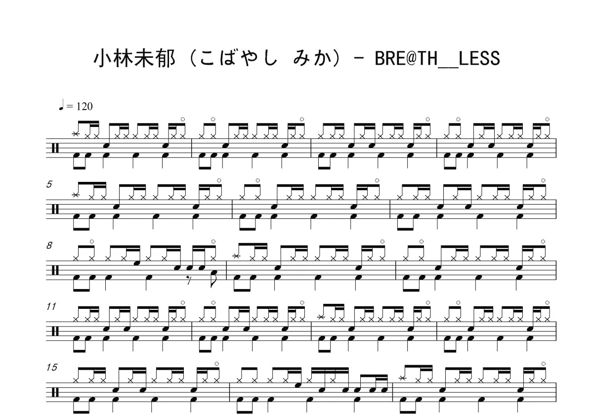 《BRE@TH__LESS》是小林未郁 (こばやし みか)演唱的一首歌曲,这份鼓谱共有三张高清图谱,图谱由 @打鼓谱 编配上传,图谱使用五线谱编配,使用这份BRE@TH__LESS架子鼓谱,你将能够轻松地敲打出这首小林未郁 (こばやし みか)的BRE@TH__LESS,快来尝试吧。《BRE@TH//LESS》是由泽野弘之参与创作,小林未郁演唱的歌曲,该歌曲收录于2014年发行的专辑《アルドノア・ゼロ 剧伴リアレンジCD》中。 小林未郁(Mika Kobayashi),1978年出生于广岛,日本女钢琴家、歌手。