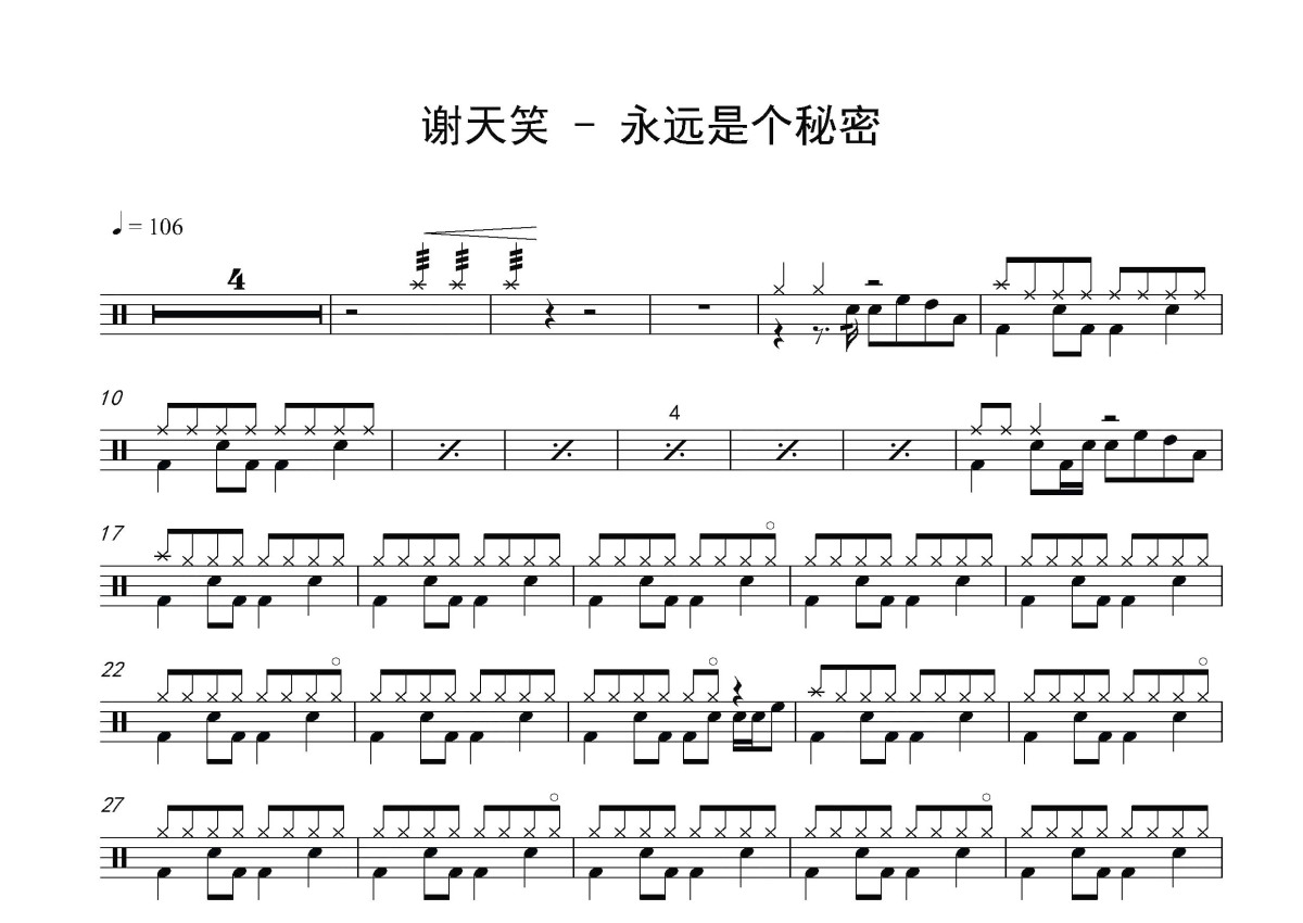 谢天笑《永远是个秘密》鼓谱 - 架子鼓谱