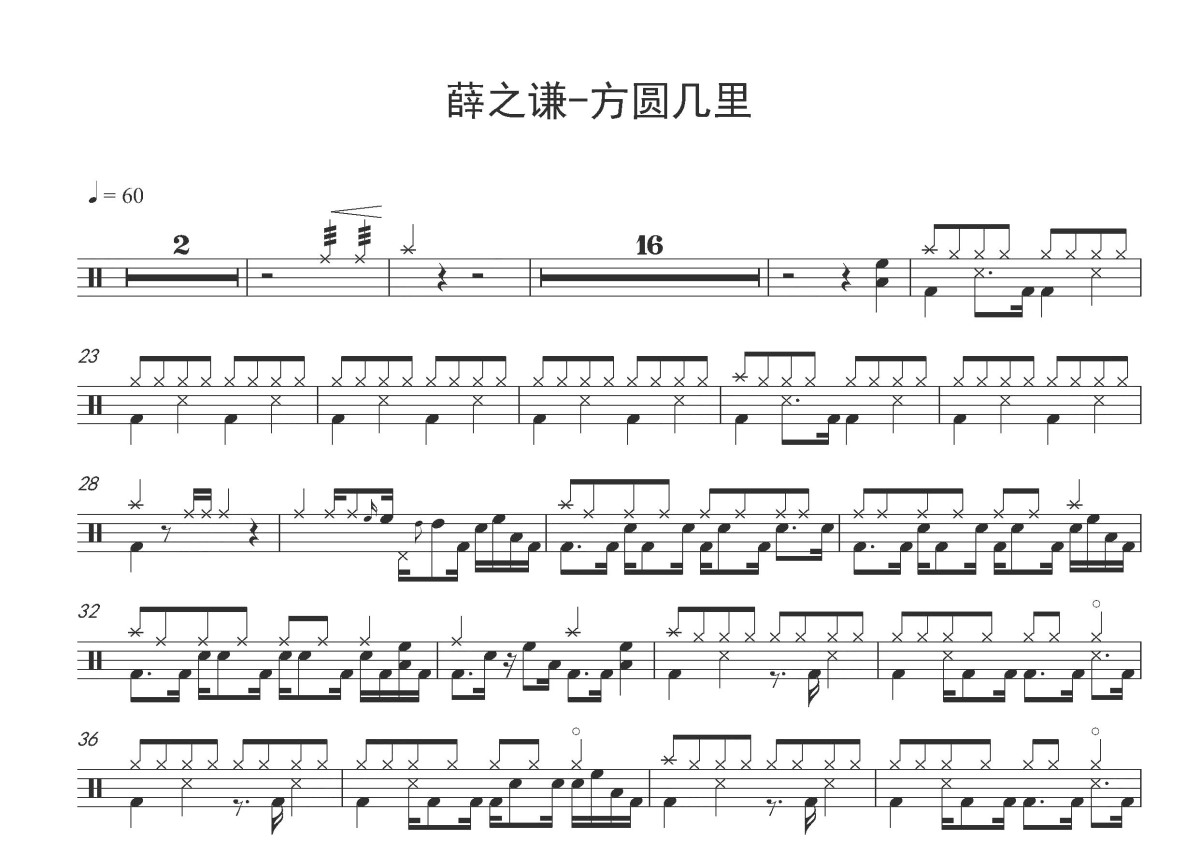 《方圆几里》是薛之谦演唱的一首歌曲,这份鼓谱共有一张高清图谱,图谱由 @打鼓谱 编配上传,图谱使用五线谱编配,使用这份方圆几里架子鼓谱,你将能够轻松地敲打出这首薛之谦的方圆几里,快来尝试吧。《方圆几里》是薛之谦填词、谱曲和演唱的国语歌曲。同时也是爱情微电影《最熟悉的陌生人》主题曲。歌曲还有一个吉他版,电影原声带版和吉他版都收录在薛之谦2013年发行的专辑《意外》中。薛之谦(Joker Xue),1983年7月17日出生于上海,中国内地流行乐男歌手、音乐制作人、影视演员,毕业于格里昂酒店管理学院。