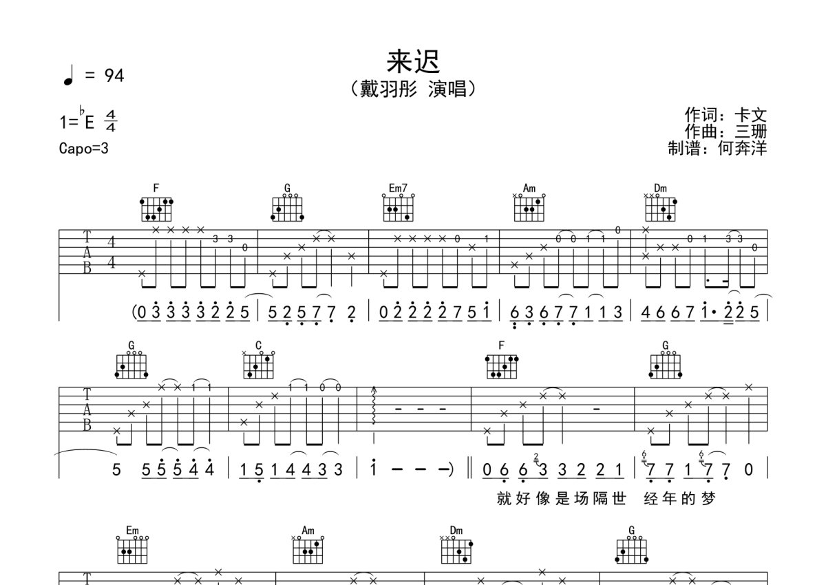 《来迟》是戴羽彤演唱的一首歌曲,本吉他谱采用的是C调指法编配,这份吉他谱共有两张高清图谱,图谱由 @何奔洋 编配上传,图谱使用六线谱编配,包含吉他和弦指法、简谱以及歌词部分,使用这份来迟吉他谱,可以让你更加方便地掌握这首歌曲的弹唱技巧,快来尝试吧。戴羽彤《来迟》吉他谱_C调吉他弹唱谱。