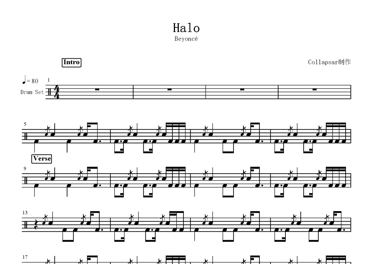 《Halo》是Beyoncé演唱的一首歌曲,这份鼓谱共有三张高清图谱,图谱由 @打鼓谱 编配上传,图谱使用五线谱编配,使用这份Halo架子鼓谱,你将能够轻松地敲打出这首Beyoncé的Halo,快来尝试吧。《Halo》是美国女歌手碧昂丝·吉赛尔·诺斯演唱的一首流行歌曲,歌词、曲谱由碧昂丝·吉赛尔·诺斯、瑞恩·泰德、E·基德·博加特合作编写,音乐出版由瑞恩·泰德、碧昂丝·吉赛尔·诺斯担任。该歌曲被收录在碧昂丝·吉赛尔·诺斯的第三张录音室专辑《I Am...Sasha Fierce》,后作为推广专辑的第四支单曲,于2009年1月20日通过哥伦比亚唱片公司发行。