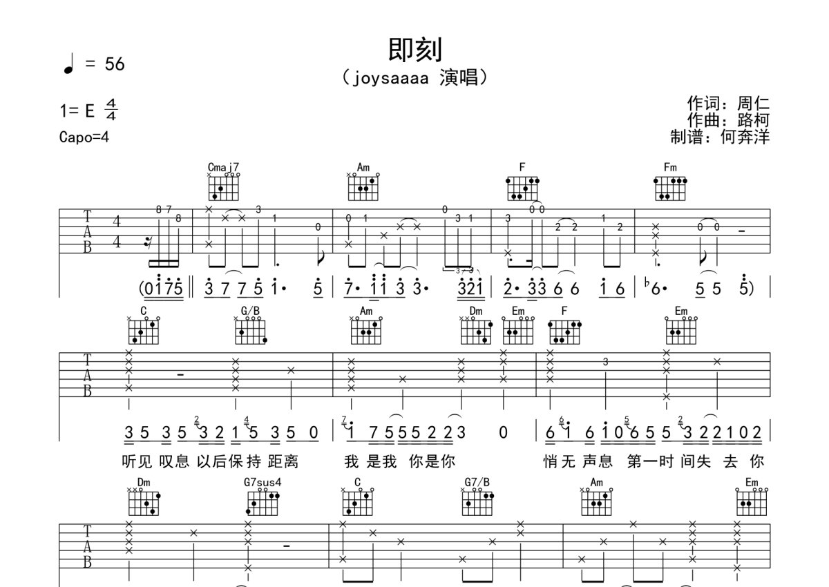 Joysaaaa《即刻》吉他谱 - C调弹唱六线谱