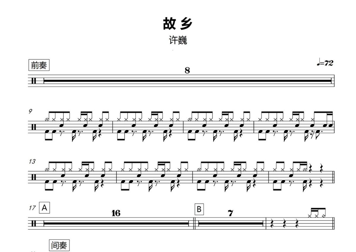 《故乡》是许巍演唱的一首歌曲,这份鼓谱共有两张高清图谱,图谱由 @打鼓谱 编配上传,图谱使用五线谱编配,使用这份故乡架子鼓谱,你将能够轻松地敲打出这首许巍的故乡,快来尝试吧。《故乡》是许巍演唱的一首歌曲,由许巍作词、作曲,收录在专辑《那一年》中,于2000年12月1日发行。该首歌曲是一首摇滚风格的歌曲,歌曲展现了许巍高超的唱功及创作功力。