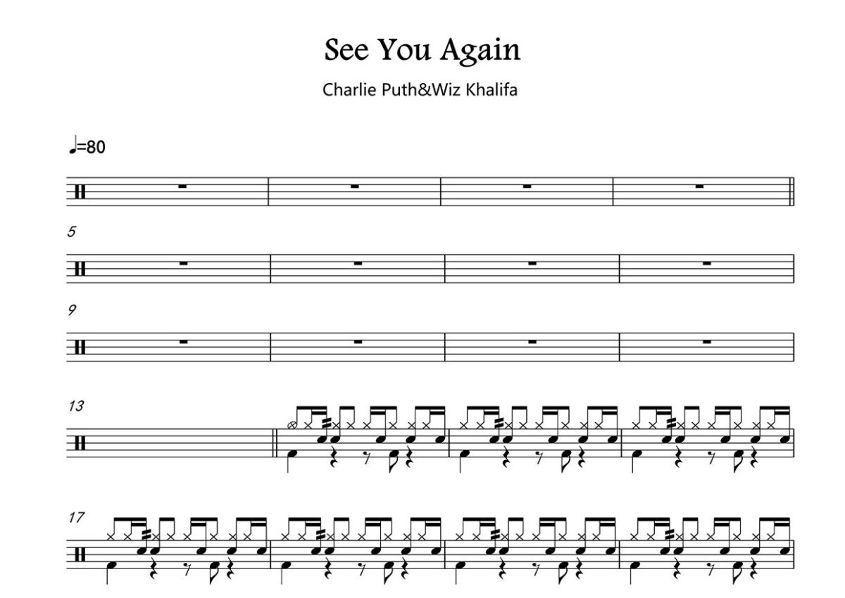 《See You Again》是Charlie Puth/Wiz Khalifa演唱的一首歌曲,这份鼓谱共有两张高清图谱,图谱由 @打鼓谱 编配上传,图谱使用五线谱编配,使用这份See You Again架子鼓谱,你将能够轻松地敲打出这首Charlie Puth/Wiz Khalifa的See You Again,快来尝试吧。《See You Again》是由美国说唱歌手维兹·卡利法与歌手查理·普斯合作演唱的一首歌曲,歌词、曲谱由DJ Frank E、查理·普斯、维兹·卡利法和安德鲁·希达尔等人共同创作完成。《See You Again》作为该电影的片尾曲和主题曲于2015年3月17日发行,被收录在电影《速度与激情7》原声专辑和查理·普斯2016年1月29日发行的录音室专辑《Nine Track Mind》中 。
