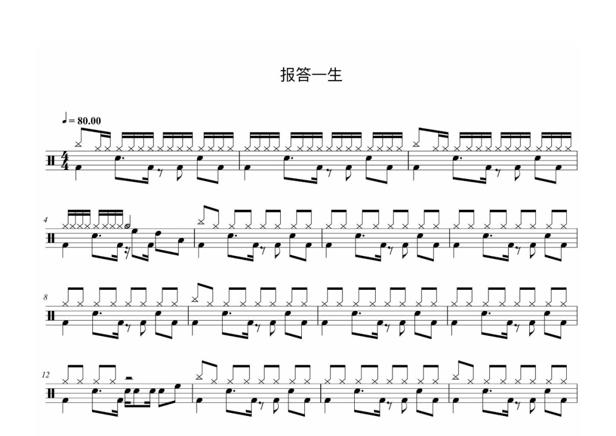 《报答一生》是Beyond演唱的一首歌曲,这份鼓谱共有三张高清图谱,图谱由 @打鼓谱 编配上传,图谱使用五线谱编配,使用这份报答一生架子鼓谱,你将能够轻松地敲打出这首Beyond的报答一生,快来尝试吧。《报答一生》是中国香港摇滚乐队Beyond的一首音乐作品,由黄家强作曲,刘卓辉作词,Beyond编曲,黄贯中演唱,黄家驹演唱歌曲和声,收录在Beyond1992年由环球唱片发行的精选集《Control》中。该曲是黄贯中主演的电影《老豆唔怕多》的片尾曲。 这是赞颂父亲的一首歌,表达对父亲的感恩。