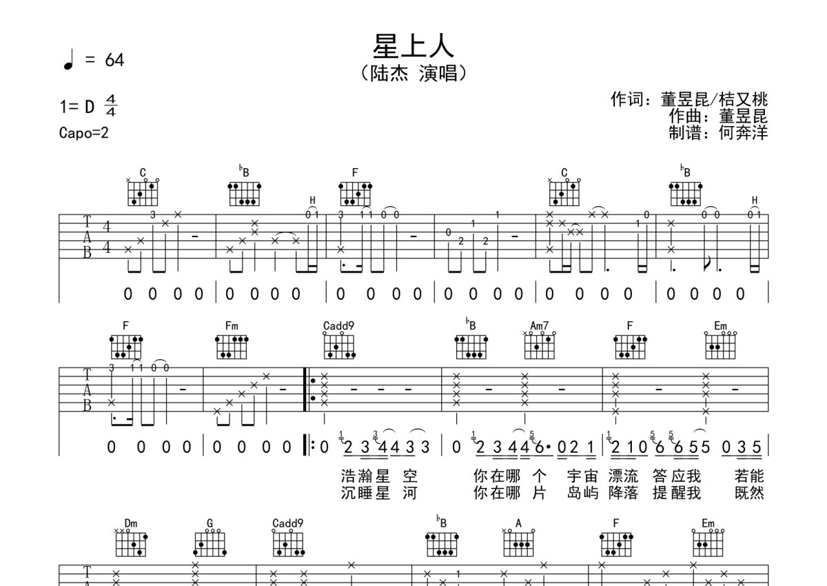陆杰《星上人》吉他谱 - C调弹唱六线谱