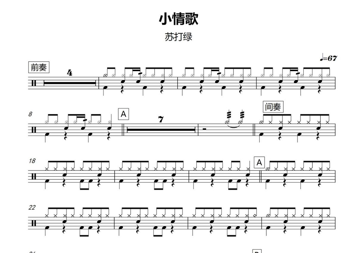 《小情歌》是苏打绿演唱的一首歌曲,这份鼓谱共有两张高清图谱,图谱由 @打鼓谱 编配上传,图谱使用五线谱编配,使用这份小情歌架子鼓谱,你将能够轻松地敲打出这首苏打绿的小情歌,快来尝试吧。《小情歌》是由吴青峰作词、作曲,苏打绿演唱的歌曲,收录于苏打绿2006年10月20日发行的专辑《小宇宙》中。该曲被选为电影《六号出口》的插曲。 2007年6月16日,吴青峰凭借该曲获得第十八届金曲奖最佳作曲人奖,该曲亦入围第十八届金曲奖最佳年度歌曲奖。