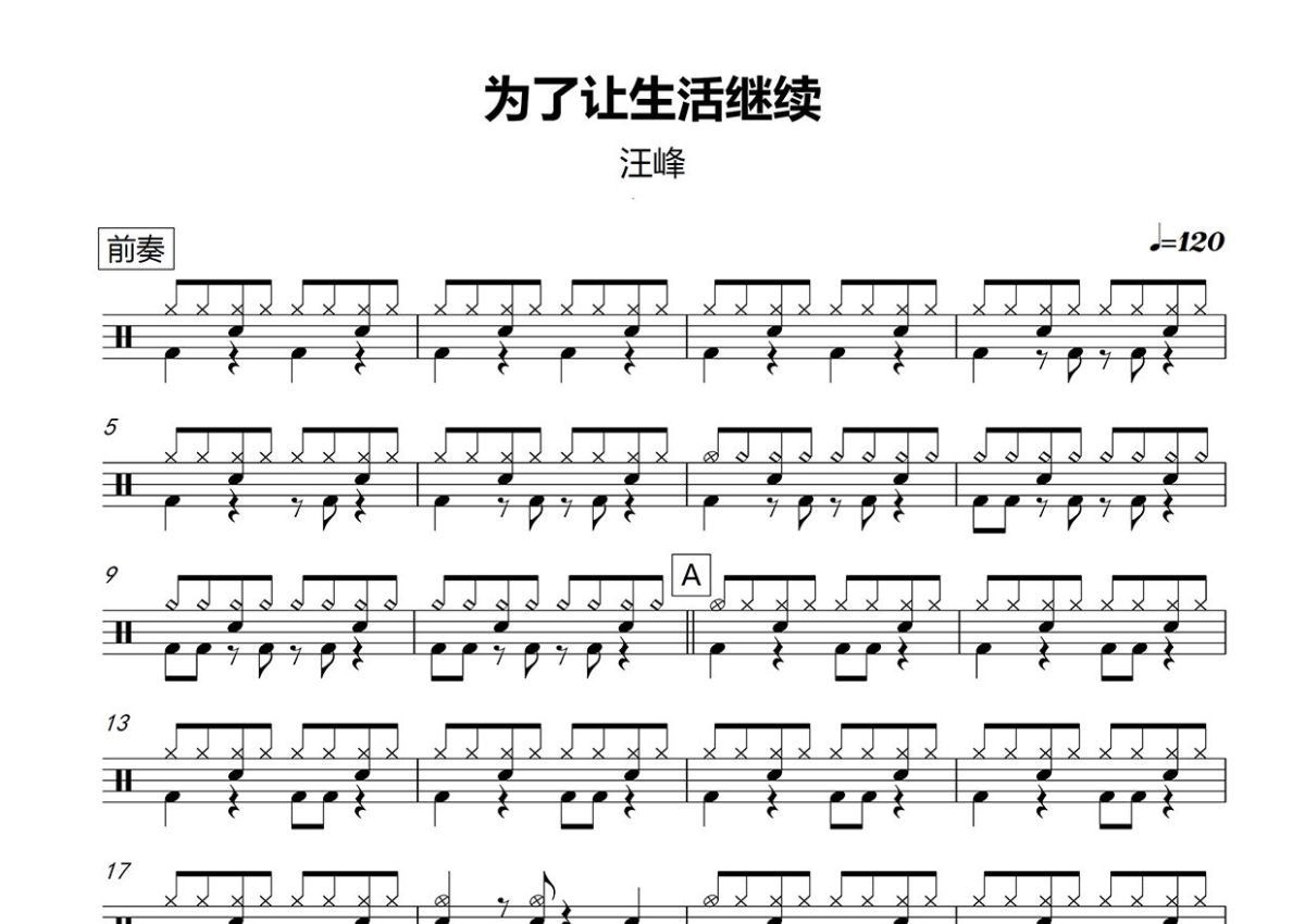 汪峰《为了让生活继续》鼓谱 - 架子鼓谱