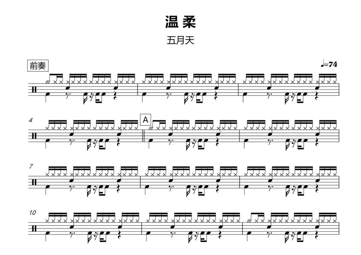 《温柔》是五月天演唱的一首歌曲,这份鼓谱共有三张高清图谱,图谱由 @打鼓谱 编配上传,图谱使用五线谱编配,使用这份温柔架子鼓谱,你将能够轻松地敲打出这首五月天的温柔,快来尝试吧。《温柔》是中国台湾摇滚乐团五月天演唱的一首歌曲,由阿信作词、作曲,五月天编曲,收录于五月天2000年7月7日由滚石唱片发行的专辑《爱情万岁》中 。
