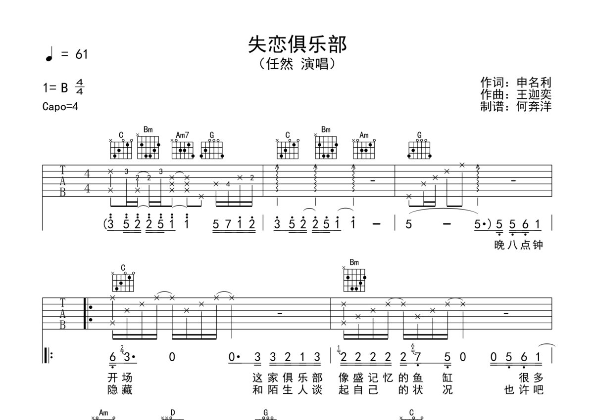 任然《失恋俱乐部》吉他谱 - G调弹唱六线谱
