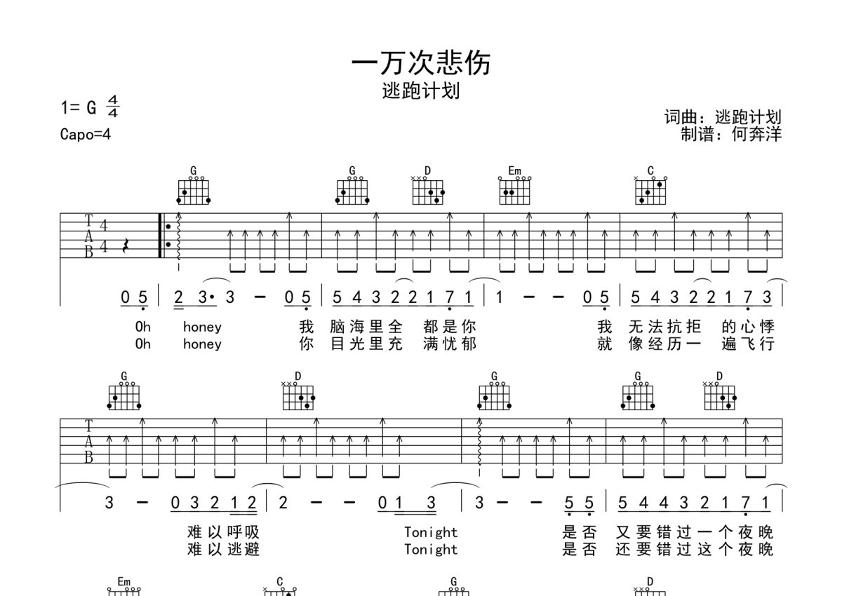 《一万次悲伤》是逃跑计划演唱的一首歌曲,新手弹唱版,本吉他谱采用的是G调指法编配,这份吉他谱共有两张高清图谱,图谱由 @何奔洋 编配上传,图谱使用六线谱编配,包含吉他和弦指法、简谱以及歌词部分,使用这份一万次悲伤吉他谱,可以让你更加方便地掌握这首歌曲的弹唱技巧,快来尝试吧。逃跑计划《一万次悲伤》吉他谱_G调吉他弹唱谱_新手弹唱版。