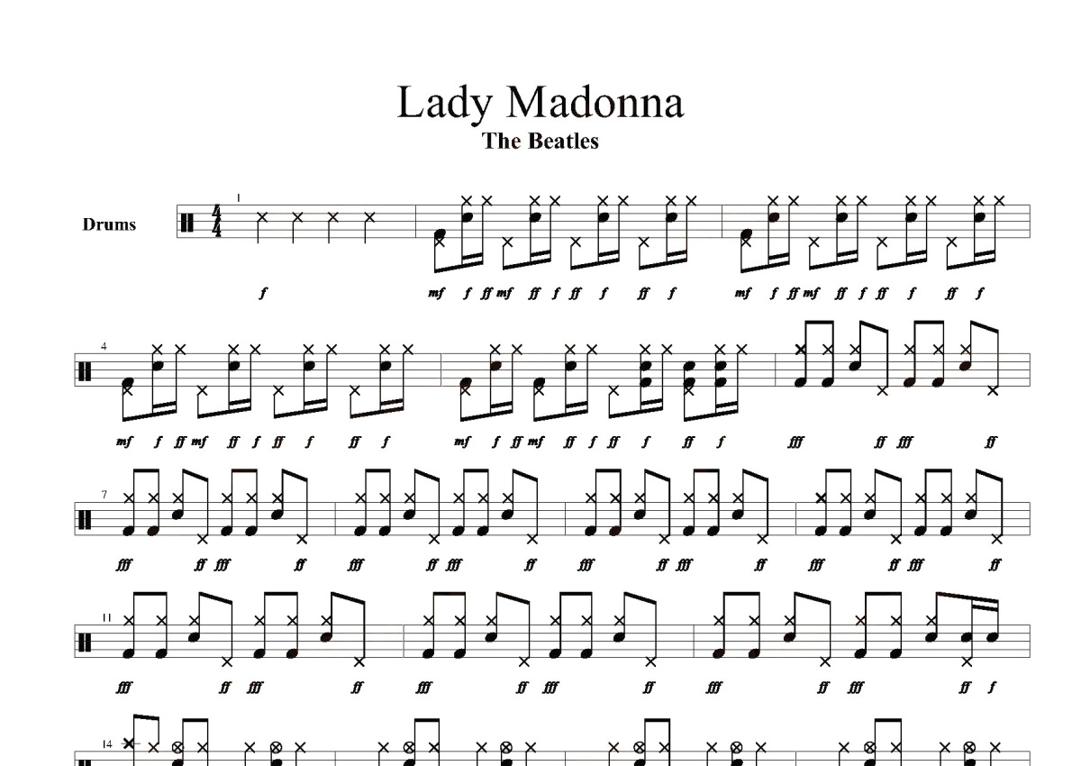 《Lady Madonna》是Beatles演唱的一首歌曲,这份鼓谱共有两张高清图谱,图谱由 @打鼓谱 编配上传,图谱使用五线谱编配,使用这份Lady Madonna架子鼓谱,你将能够轻松地敲打出这首Beatles的Lady Madonna,快来尝试吧。《Lady Madonna》一歌由Paul McCartney创作(署名Lennon-McCartney),1968年3月15日作为单曲发行,单曲B面为《The Inner Light》。歌曲在The Beatles前往印度前的1968年2月3日和6日录制完成。单曲是乐队由Parlophone唱片在英国和Capitol唱片在美国发行的最后一支乐队单曲,歌曲在这两个国家分别达到第1和第4名。从随后1968年8月的《Hey Jude》开始,乐队作品都是由乐队所有的Apple唱片发行,直到70年代末,Capit。