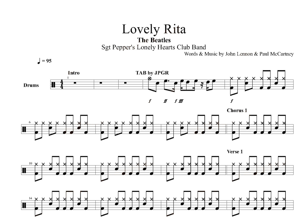 《Lovely Rita》是Beatles演唱的一首歌曲,这份鼓谱共有两张高清图谱,图谱由 @打鼓谱 编配上传,图谱使用五线谱编配,使用这份Lovely Rita架子鼓谱,你将能够轻松地敲打出这首Beatles的Lovely Rita,快来尝试吧。歌曲名:Lovely Rita 歌手:The Beatles 专辑:Box Set_disc 8 Lovely Rita meter maid, lovely Rita meter maid Lovely Rita meter maid, nothing can come betwe...。