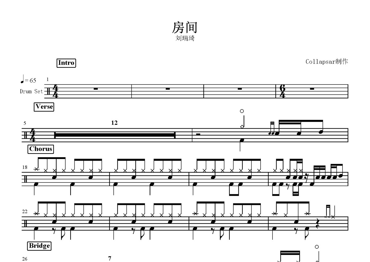 刘瑞琦《房间》鼓谱 - 架子鼓谱