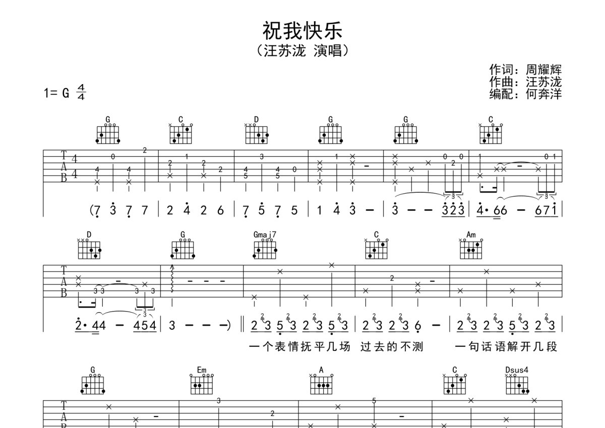 汪苏泷《祝我快乐》吉他谱 - G调弹唱六线谱
