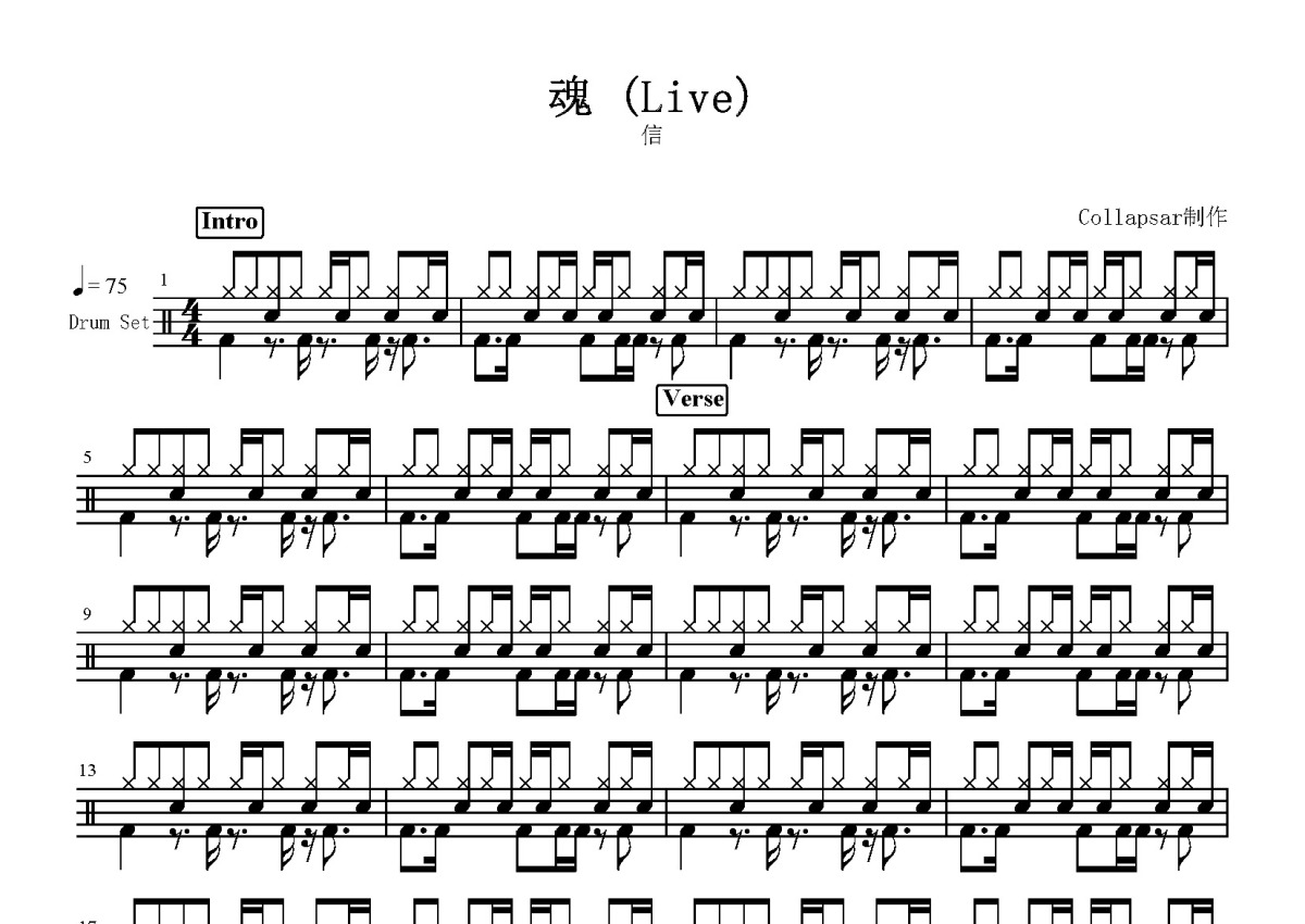 《魂》是信演唱的一首歌曲,这份鼓谱共有两张高清图谱,图谱由 @打鼓谱 编配上传,图谱使用五线谱编配,使用这份魂架子鼓谱,你将能够轻松地敲打出这首信的魂,快来尝试吧。《魂》是信演唱的一首歌曲,收录在专辑《集乐星球》当中。