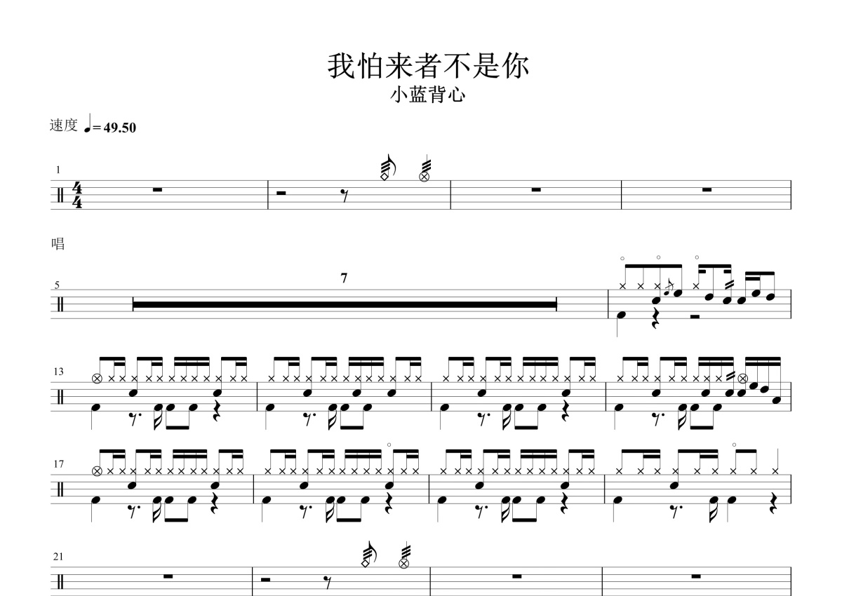 《我怕来者不是你》是小蓝背心演唱的一首歌曲,这份鼓谱共有一张高清图谱,图谱由 @打鼓谱 编配上传,图谱使用五线谱编配,使用这份我怕来者不是你架子鼓谱,你将能够轻松地敲打出这首小蓝背心的我怕来者不是你,快来尝试吧。《我怕来者不是你》是由Seven作词,孙成龙作曲,小蓝背心演唱的歌曲,发行于2021年7月24日。