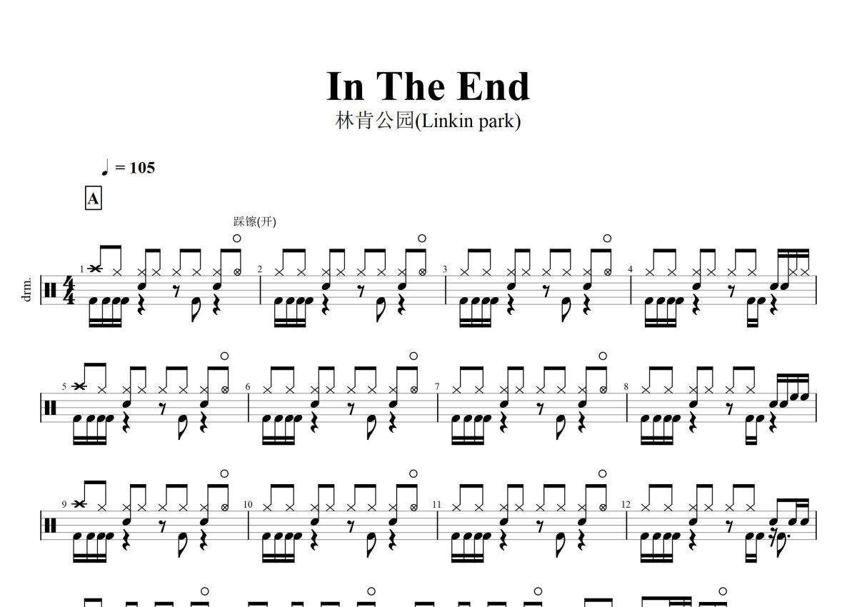 《in the end》是林肯公园Linkin Park演唱的一首歌曲,这份鼓谱共有三张高清图谱,图谱由 @打鼓谱 编配上传,图谱使用五线谱编配,使用这份in the end架子鼓谱,你将能够轻松地敲打出这首林肯公园Linkin Park的in the end,快来尝试吧。《In the End》是美国摇滚乐队林肯公园演唱的歌曲,由查斯特·贝宁顿、布莱德·德尔森、约瑟夫·韩、麦克·信田、罗伯·巴登填词、谱曲。歌曲被收录在林肯公园首张录音室专辑《Hybrid Theory》中,于2001年10月9日作为专辑的第四支单曲发行 。