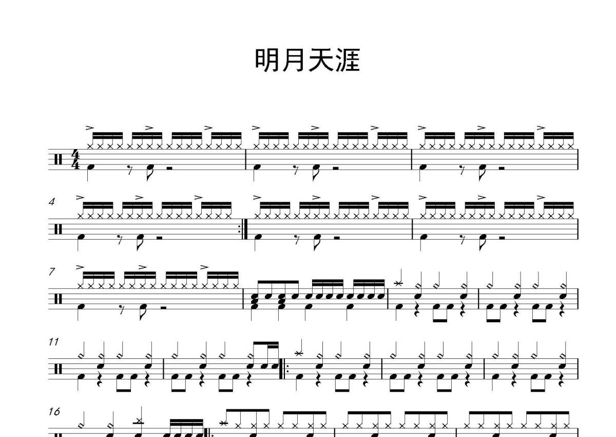 《明月天涯》是五音Jw演唱的一首歌曲,这份鼓谱共有两张高清图谱,图谱由 @打鼓谱 编配上传,图谱使用五线谱编配,使用这份明月天涯架子鼓谱,你将能够轻松地敲打出这首五音Jw的明月天涯,快来尝试吧。《明月天涯》是五音JW专辑《聆音》所收录歌曲,由潮汐tide作曲,宏宇编曲,无比作词。这首明月天涯,是整张《聆音》专辑中歌手个人最偏爱的曲风之一。2016年,网游《天涯明月刀》官方宣布:该歌曲已被腾讯旗下的武侠网游《天涯明月刀》买下版权,作为游戏的宣传曲之一,其他游戏不可以商用。五音Jw,男,中国籍,国风原创音乐人、歌手, 5sing原创音乐基地音乐人,聆云音乐品牌创始人。