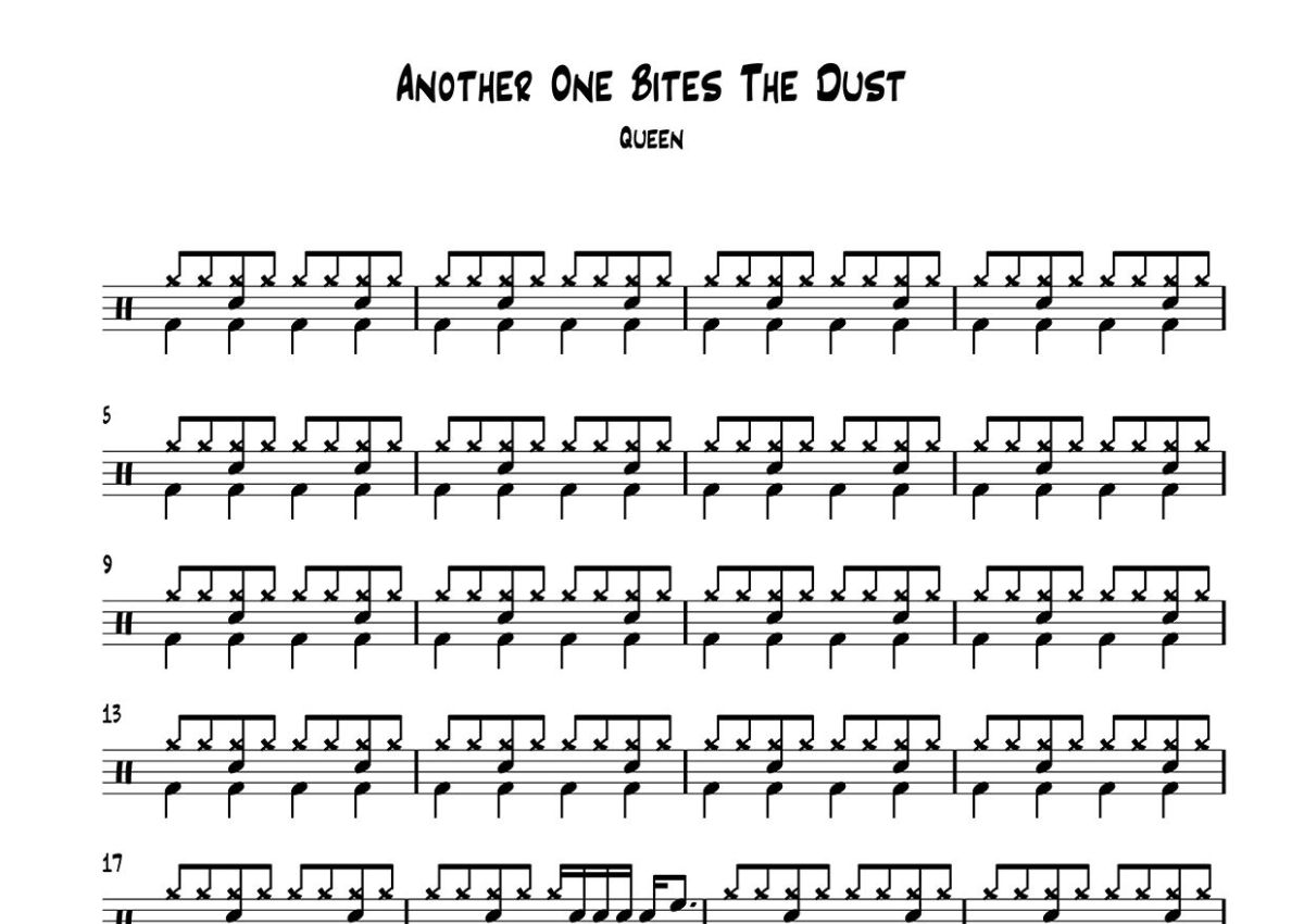 《Another One Bites The Dust》是Queen(皇后乐队)演唱的一首歌曲,这份鼓谱共有三张高清图谱,图谱由 @打鼓谱 编配上传,图谱使用五线谱编配,使用这份Another One Bites The Dust架子鼓谱,你将能够轻松地敲打出这首Queen(皇后乐队)的Another One Bites The Dust,快来尝试吧。皇后乐队于80年代的专辑《The Game》中的一首单曲。