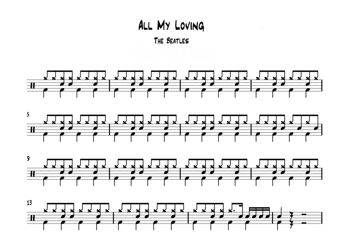 《All My Loving》是The Beatles演唱的一首歌曲,拍号为4/4拍,这份鼓谱共有两张高清图谱,图谱由 @打鼓谱 编配上传,图谱使用五线谱编配,使用这份All My Loving架子鼓谱,你将能够轻松地敲打出这首The Beatles的All My Loving,快来尝试吧。这是英国摇滚乐团The Beatles的作品,来自于1963年的专辑《With The Beatles》,由Paul McCartney所作(后来写为Lennon-McCartney)。All my loving是他们于1963年2月9日在美国处女秀The Ed Sullivan Show的开场曲,也是大多数美国人所听的这个团体的第一首歌。