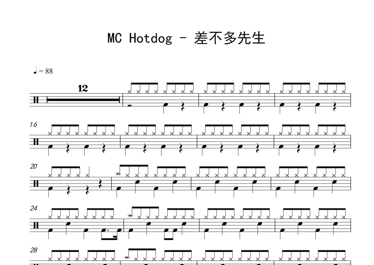 《差不多先生》是MC HotDog演唱的一首歌曲,这份鼓谱共有两张高清图谱,图谱由 @打鼓谱 编配上传,图谱使用五线谱编配,使用这份差不多先生架子鼓谱,你将能够轻松地敲打出这首MC HotDog的差不多先生,快来尝试吧。《差不多先生》是收录于MC HotDog同名专辑《差不多先生》中的一首rap歌曲,由饶舌歌手MC HotDog作词演唱,张震岳作曲,时长4分26秒。 MC Hotdog,1978年4月10日出生于中国台湾省台北市,中国台湾饶舌男歌手,曾就读台北市立建国中学补校,毕业于天主教辅仁大学大众传播学系。
