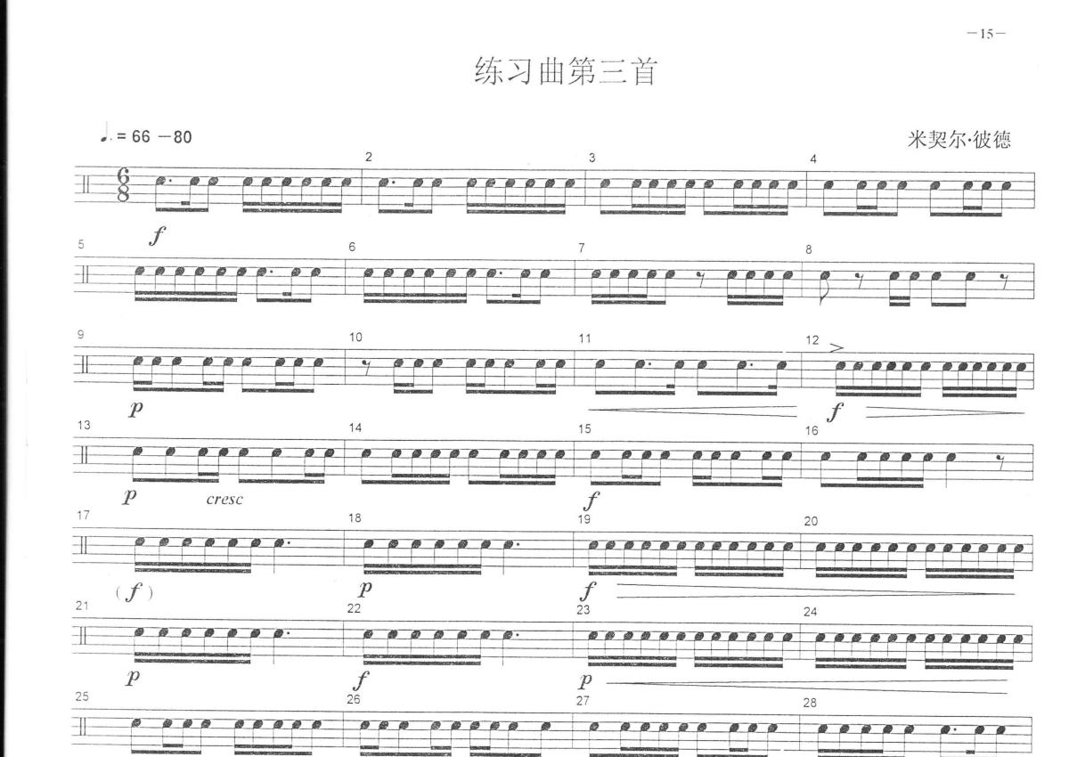 《练习曲第三首》是中央音乐学院小鼓考级教程演唱的一首歌曲,这份鼓谱共有一张高清图谱,图谱由 @打鼓谱 编配上传,图谱使用五线谱编配,使用这份练习曲第三首架子鼓谱,你将能够轻松地敲打出这首中央音乐学院小鼓考级教程的练习曲第三首,快来尝试吧。此考级教材皆被中央音乐学院、中国音乐学院认可。