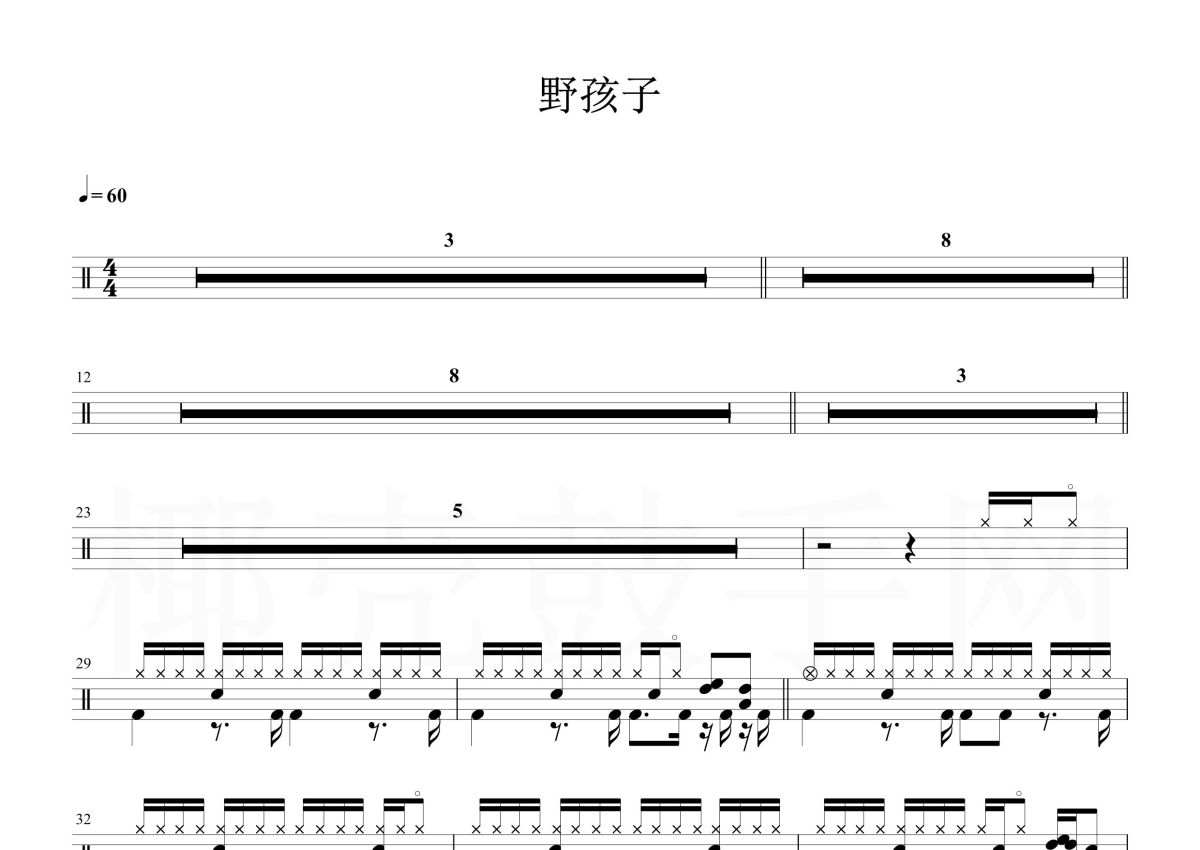 《野孩子》是杨千嬅演唱的一首歌曲,这份鼓谱共有两张高清图谱,图谱由 @打鼓谱 编配上传,图谱使用五线谱编配,使用这份野孩子架子鼓谱,你将能够轻松地敲打出这首杨千嬅的野孩子,快来尝试吧。《野孩子》是香港流行歌手杨千嬅的一首粤语歌曲,由黄伟文作词,雷颂德作曲,杨千嬅演唱。收录于专辑《Miriam》中,发行于2001年9月22日。杨千嬅,原名杨泽嬅,1974年2月3日出生于中国香港,祖籍广东汕头,中国香港流行乐女歌手、影视演员,毕业于香港理工大学。