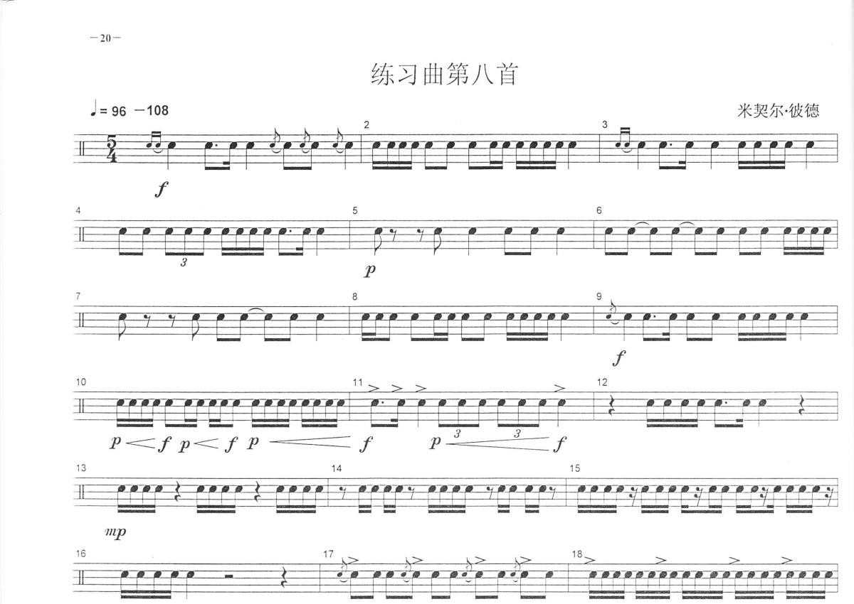《练习曲第八首》是中央音乐学院小鼓考级教程演唱的一首歌曲,这份鼓谱共有一张高清图谱,图谱由 @打鼓谱 编配上传,图谱使用五线谱编配,使用这份练习曲第八首架子鼓谱,你将能够轻松地敲打出这首中央音乐学院小鼓考级教程的练习曲第八首,快来尝试吧。此考级教材皆被中央音乐学院、中国音乐学院认可。
