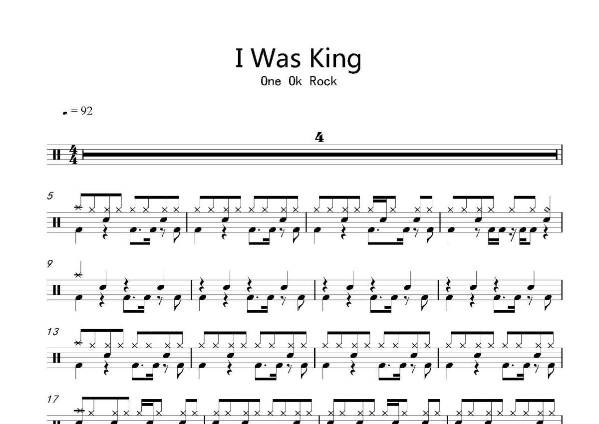 《I Was King》是ONE OK ROCK演唱的一首歌曲,这份鼓谱共有两张高清图谱,图谱由 @打鼓谱 编配上传,图谱使用五线谱编配,使用这份I Was King架子鼓谱,你将能够轻松地敲打出这首ONE OK ROCK的I Was King,快来尝试吧。《I Was King》是华纳唱片发行于2017年1月的一首英语歌曲,由ONE OK ROCK演唱。 ONE OK ROCK(ワンオケロック)是一支日本摇滚乐队,于2005年成立,2007年正式出道。凭借扎实的音乐功底,前沿的曲风和热血激昂的现场表现力已稳固发展成为地位超群的实力团体,并受到全球范围内的粉丝追捧。乐队现成员包括主唱Taka、吉他手Toru、贝斯手Ryota、鼓手Tomoya四人。