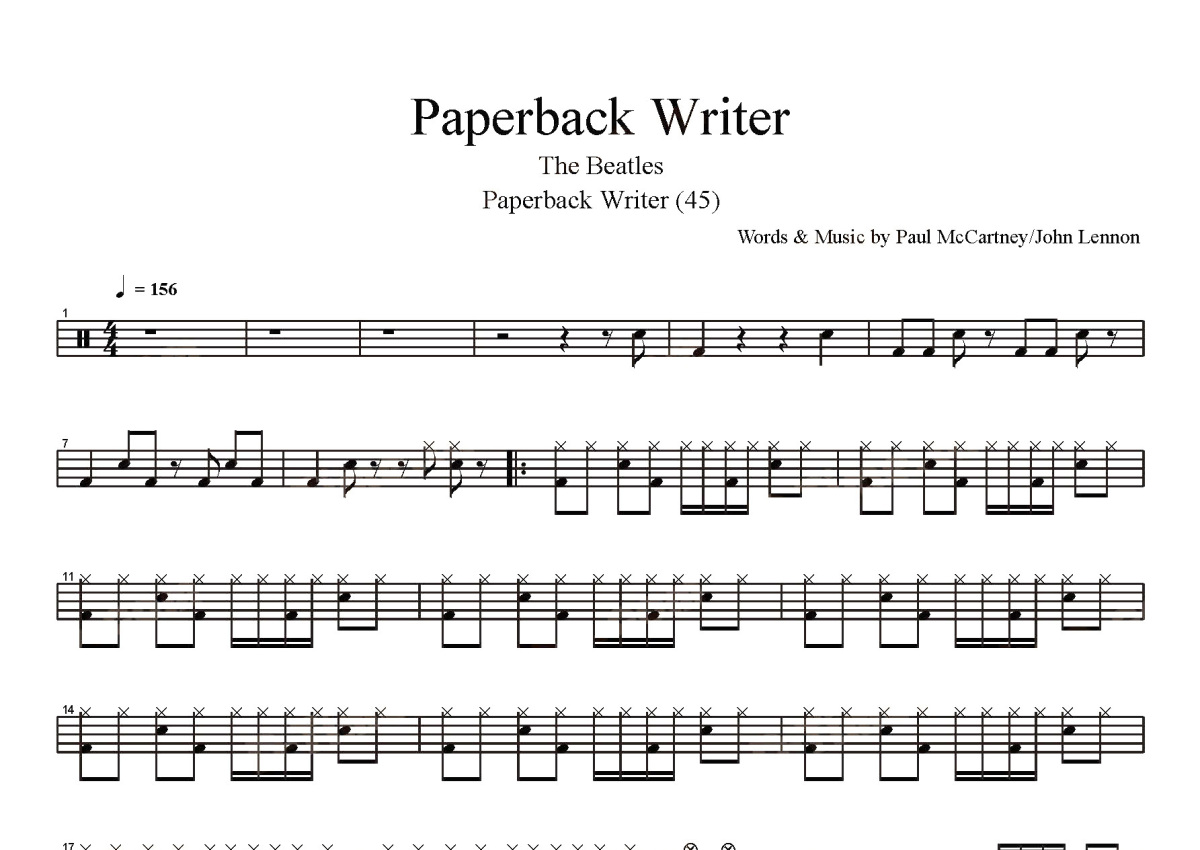 《Paperback Writer》是Beatles -演唱的一首歌曲,这份鼓谱共有两张高清图谱,图谱由 @打鼓谱 编配上传,图谱使用五线谱编配,使用这份Paperback Writer架子鼓谱,你将能够轻松地敲打出这首Beatles -的Paperback Writer,快来尝试吧。Paperback Writer是英国摇滚乐队The Beatles1966年录制并在同年发行的一首单曲。作者为Paul McCartney和John Lennon,署名“Lennon-McCartney”。 这是披头士乐队第17张单曲的A面主打,这首歌在美国、英国、澳大利亚、德国、新西兰、挪威成为了冠军单曲,此时的披头士正处于事业的巅峰。