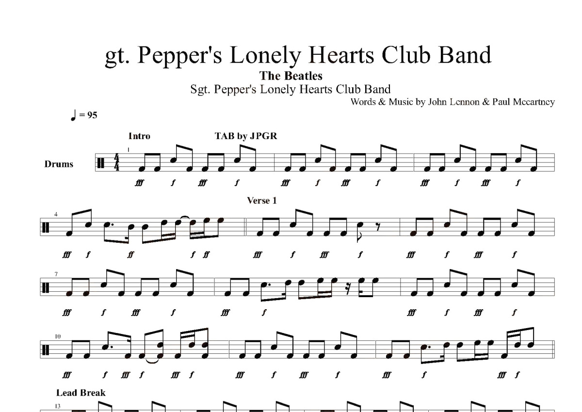 《gt.pepper's lonfely hearts club band》是Beatles演唱的一首歌曲,这份鼓谱共有两张高清图谱,图谱由 @打鼓谱 编配上传,图谱使用五线谱编配,使用这份gt.pepper's lonfely hearts club band架子鼓谱,你将能够轻松地敲打出这首Beatles的gt.pepper's lonfely hearts club band,快来尝试吧。gt.pepper's lonfely hearts club band。