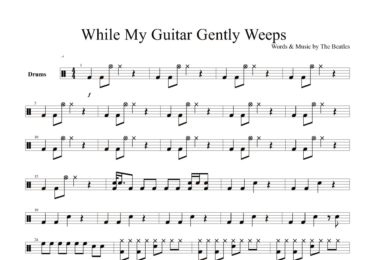 《While My Guitar Gently Weeps》是Beatles演唱的一首歌曲,这份鼓谱共有四张高清图谱,图谱由 @打鼓谱 编配上传,图谱使用五线谱编配,使用这份While My Guitar Gently Weeps架子鼓谱,你将能够轻松地敲打出这首Beatles的While My Guitar Gently Weeps,快来尝试吧。《While My Guitar Gently Weeps》是披头士乐队创作歌曲,由乔治·哈里森演唱,收录在其音乐专辑《The Beatle(White Album)》中。