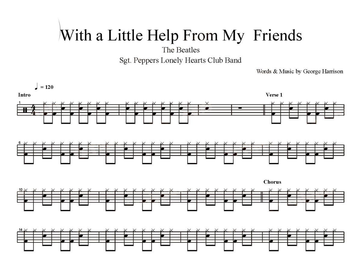 《With A Little Help From My Friends》是Beatles演唱的一首歌曲,这份鼓谱共有两张高清图谱,图谱由 @打鼓谱 编配上传,图谱使用五线谱编配,使用这份With A Little Help From My Friends架子鼓谱,你将能够轻松地敲打出这首Beatles的With A Little Help From My Friends,快来尝试吧。《With a Little Help From My Friends》(原始名称:A Little Help From My Friends),由John Lennon和Paul McCartney创作,收录于1967年发行的专辑《Sgt. Pepper's Lonely Hearts Club Band》。这首歌是为乐队鼓手Ringo Starr所作、并且由其所唱。Ringo Starr在歌中的角色为“Billy Shears”。