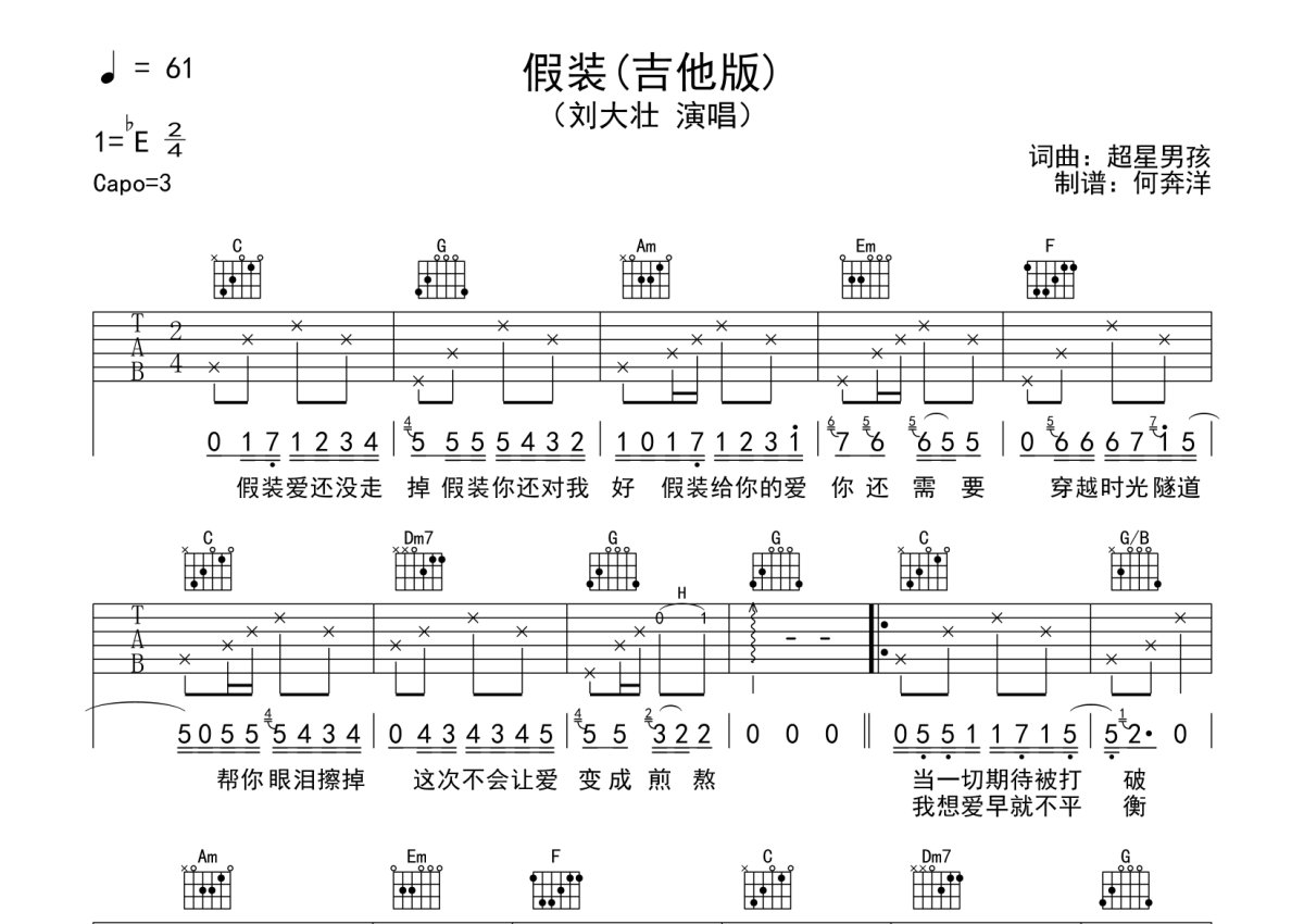 刘大壮《假装》吉他谱 - C调弹唱六线谱