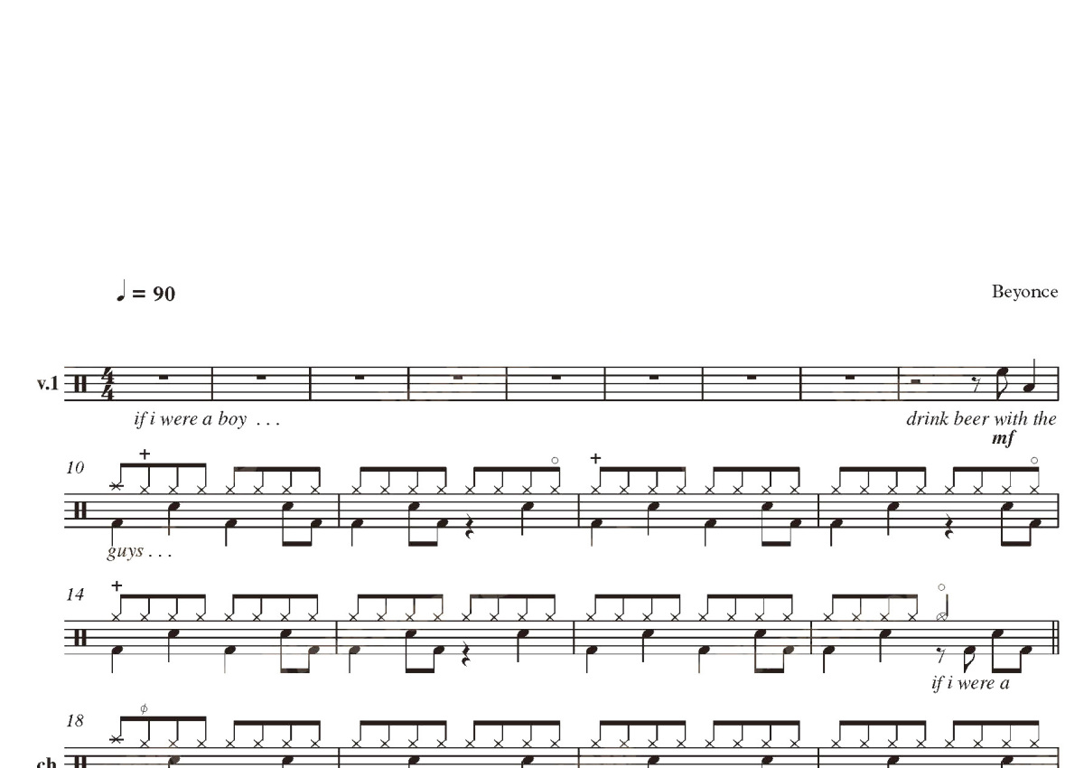 《If i were a boy》是Beyonce演唱的一首歌曲,这份鼓谱共有两张高清图谱,图谱由 @打鼓谱 编配上传,图谱使用五线谱编配,使用这份If i were a boy架子鼓谱,你将能够轻松地敲打出这首Beyonce的If i were a boy,快来尝试吧。《If I Were a Boy》是美国女歌手碧昂丝·吉赛尔·诺斯演唱的一首“成人时代”歌曲,歌词、曲谱由BC·简和托比·盖德填写。该歌曲作为推广专辑的首支单曲,于2008年10月12日通过索尼音乐娱乐公司发行 [1] ,后被收录在碧昂丝·吉赛尔·诺斯的第三张录音室专辑《I Am...Sasha Fierce》 [2] 。2009年2月3日,歌曲的西班牙语版《Si Yo Fuera un Chico》被发布。