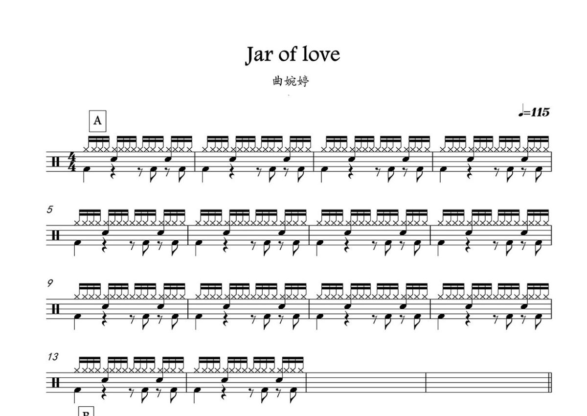 《Jar of love》是曲婉婷演唱的一首歌曲,这份鼓谱共有三张高清图谱,图谱由 @打鼓谱 编配上传,图谱使用五线谱编配,使用这份Jar of love架子鼓谱,你将能够轻松地敲打出这首曲婉婷的Jar of love,快来尝试吧。《Jar of Love》是中国原创音乐人曲婉婷的一首作品,收录在其首张专辑《Everything In The World》(北美版)和《我的歌声里》(亚洲版)中。 。