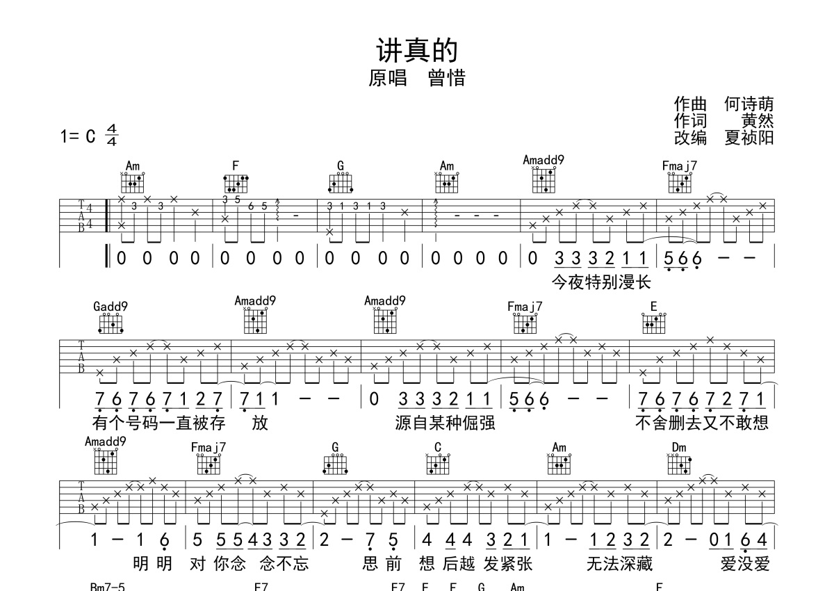 曾惜《讲真的》吉他谱 - C调弹唱六线谱