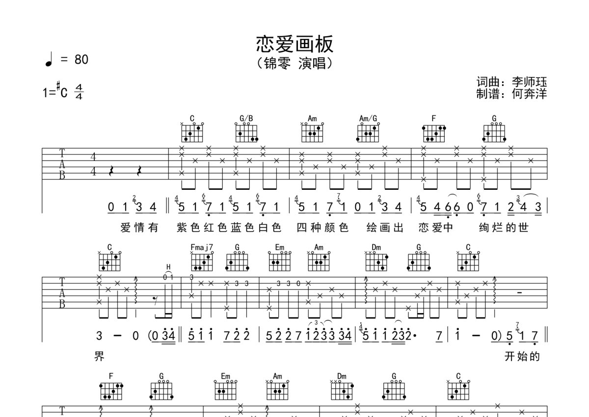 锦零《恋爱画板》吉他谱 - C调弹唱六线谱