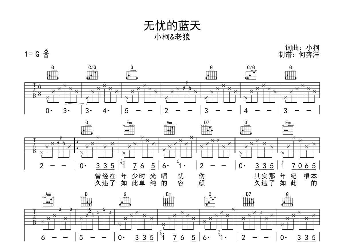 老狼/小柯《无忧的蓝天》吉他谱 - G调弹唱六线谱