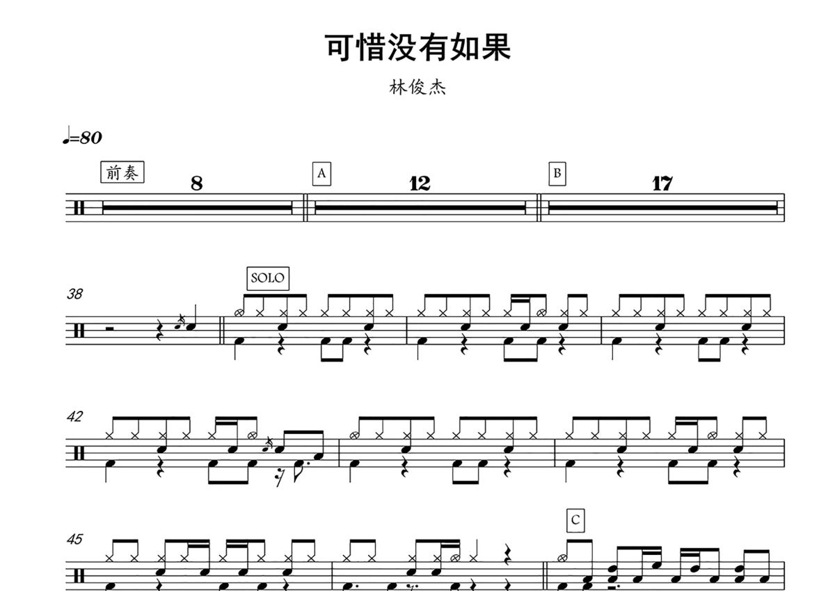 《可惜没如果》是林俊杰演唱的一首歌曲,这份鼓谱共有两张高清图谱,图谱由 @打鼓谱 编配上传,图谱使用五线谱编配,使用这份可惜没如果架子鼓谱,你将能够轻松地敲打出这首林俊杰的可惜没如果,快来尝试吧。《可惜没如果》由林夕作词,蔡政勋编曲,林俊杰作曲并演唱的歌曲,收录在林俊杰第11张个人专辑《新地球GENESIS》中,是专辑的首波抒情主打,同时也是韩剧《杜鹃之巢》的中文主题曲、《对我而言,可爱的她》的中文片尾曲。
