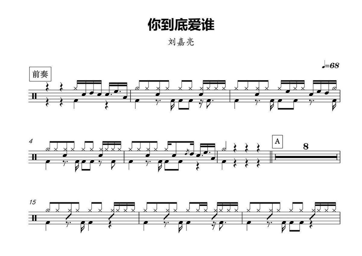 《你到底爱谁》是刘嘉亮演唱的一首歌曲,这份鼓谱共有三张高清图谱,图谱由 @打鼓谱 编配上传,图谱使用五线谱编配,使用这份你到底爱谁架子鼓谱,你将能够轻松地敲打出这首刘嘉亮的你到底爱谁,快来尝试吧。《你到底爱谁》是由刘嘉亮作词作曲并演唱的歌曲,收录于刘嘉亮2005年9月1日发行的专辑《你到底爱谁》中 。