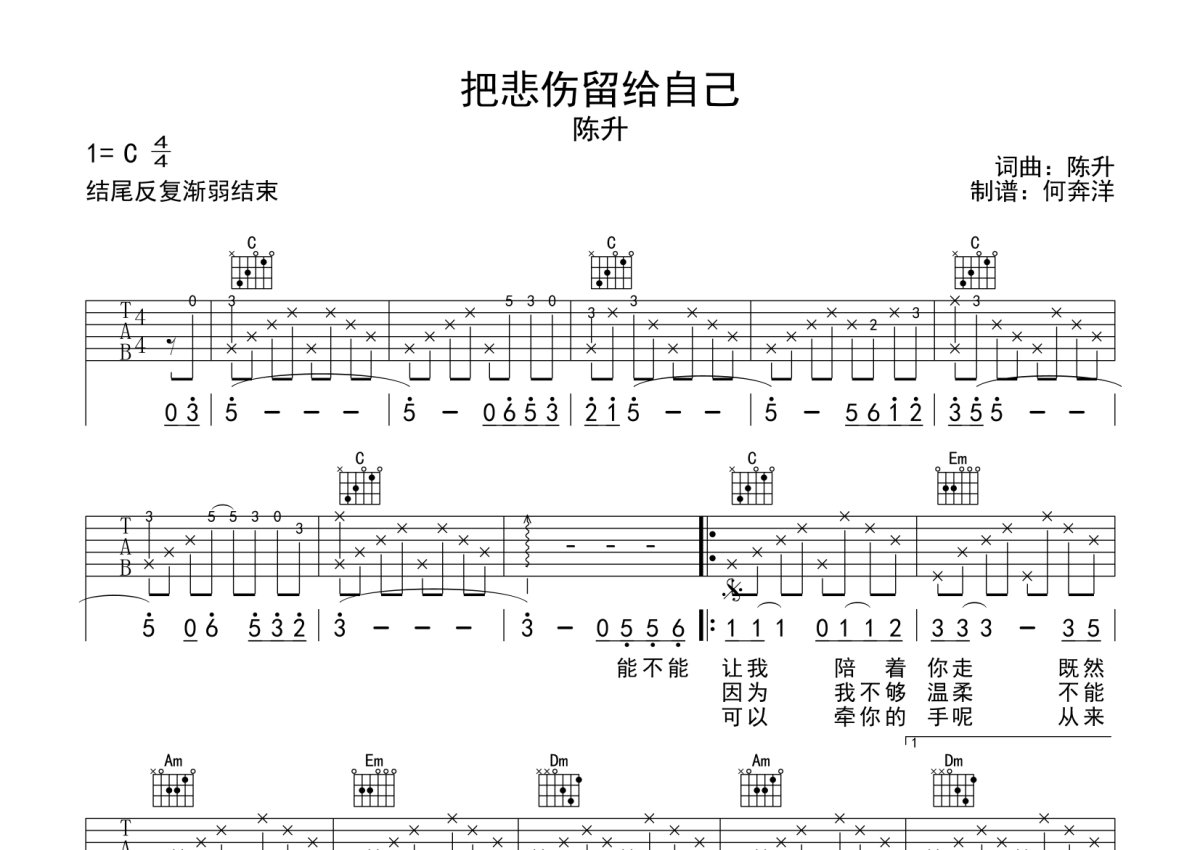 陈升《把悲伤留给自己》吉他谱 - C调弹唱六线谱