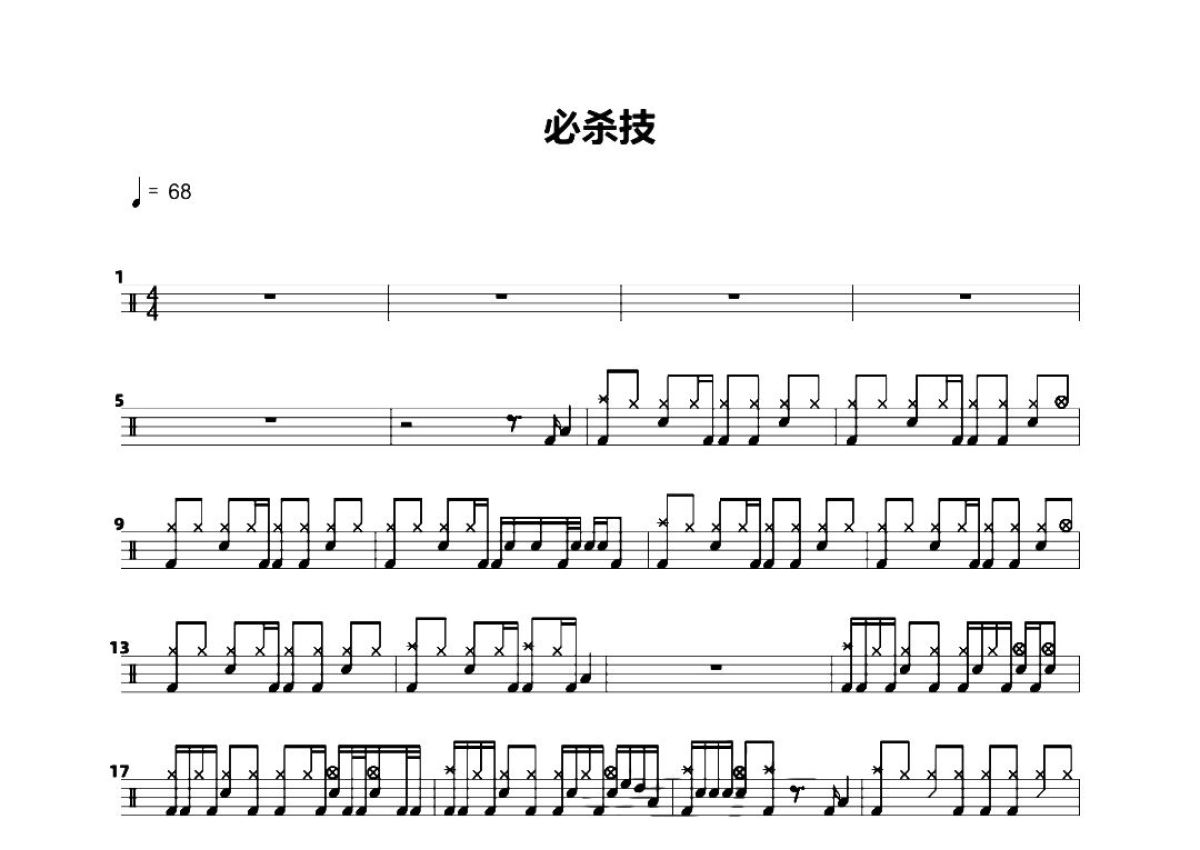 《必杀技》是古巨基演唱的一首歌曲,这份鼓谱共有两张高清图谱,图谱由 @打鼓谱 编配上传,图谱使用五线谱编配,使用这份必杀技架子鼓谱,你将能够轻松地敲打出这首古巨基的必杀技,快来尝试吧。《必杀技》是由林夕作词,林健华作曲,Robert Lay编曲,古巨基演唱的一首歌曲,收录于专辑《游戏-基》中,发行于2003年12月05日。